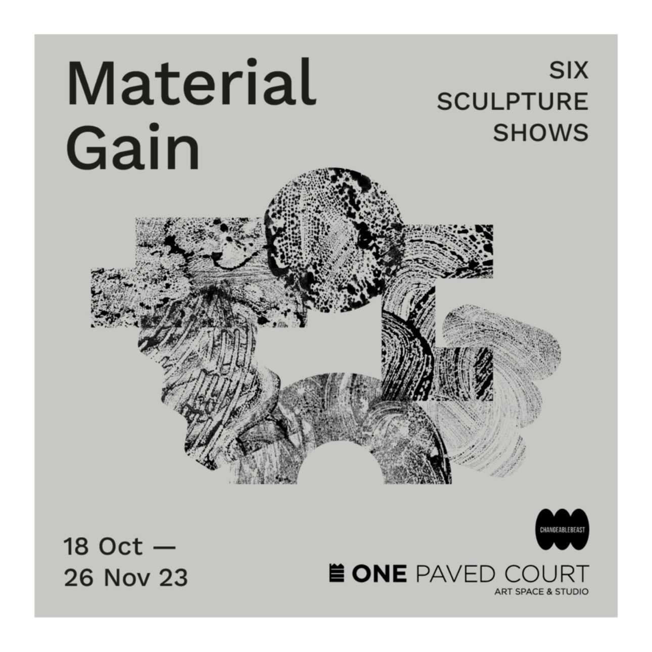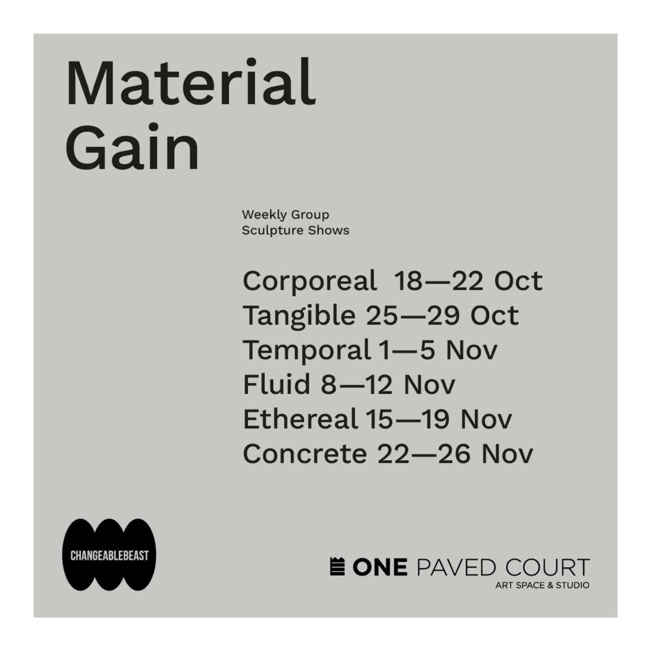Material Gain was a group sculpture show over six weeks. Changing artists each week with weekly Saturday events including workshops, talks and performances